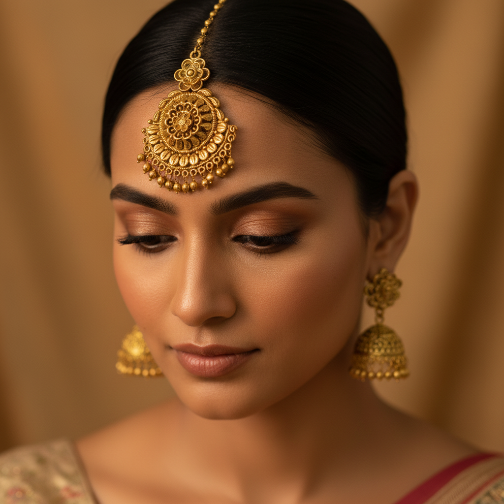 Elevate your bridal ensemble with this exquisite antique maang tika, a timeless piece that embodies traditional craftsmanship and heritage elegance. Meticulously designed with intricate detailing, this maang tika features ornamental elements that gracefully drape from the center parting, creating a striking focal point. The antique finish lends an authentic vintage charm, making it an ideal choice for weddings, festivals, and special occasions. Perfect for those who appreciate classical Indian jewelry aesthetics, this piece seamlessly blends cultural significance with refined sophistication, ensuring you stand out with understated grandeur.
